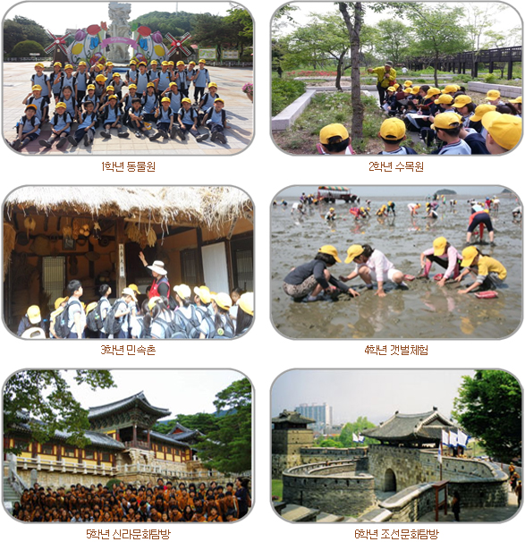 교육과정과 연계한 학년별 현장체험학습 활동을 코스제로 운영하고, 문제해결과 다양한 경험의 기회를 제공하여 창의적 사고력을 길러주고 있다.