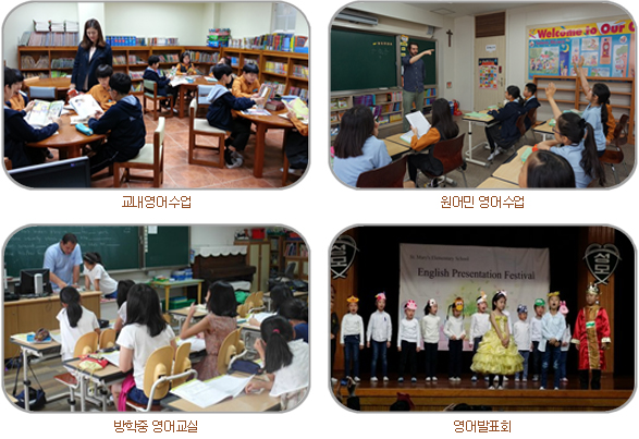 영어 교육은 생활영어 중심 교육으로 국내 영어 교사와 원어민 강사가 함께 팀티칭을 이루어 수업하고, 방학동안에는 영어캠프를 실시하고 있다.