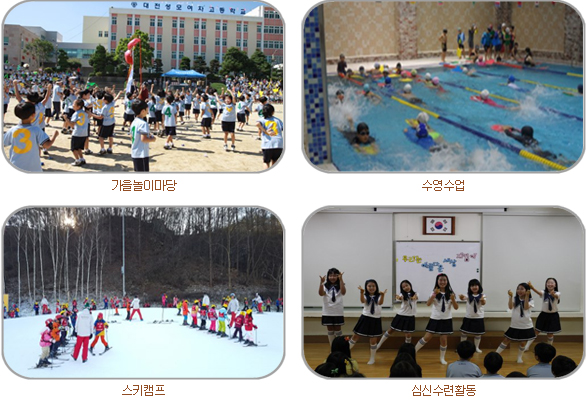 체육 수업은 3~6학년 체육 전담교사를 배치하여 체육 수업을 하고, 전교생 수영수업, 전교생 스크캠프를 개설하여 계절운동을 집중적으로 실시하고 있으며, 구기대회와 가을놀이마당을 통해 다양한 체육활동과 표현의 기회를 제공하고 있다.