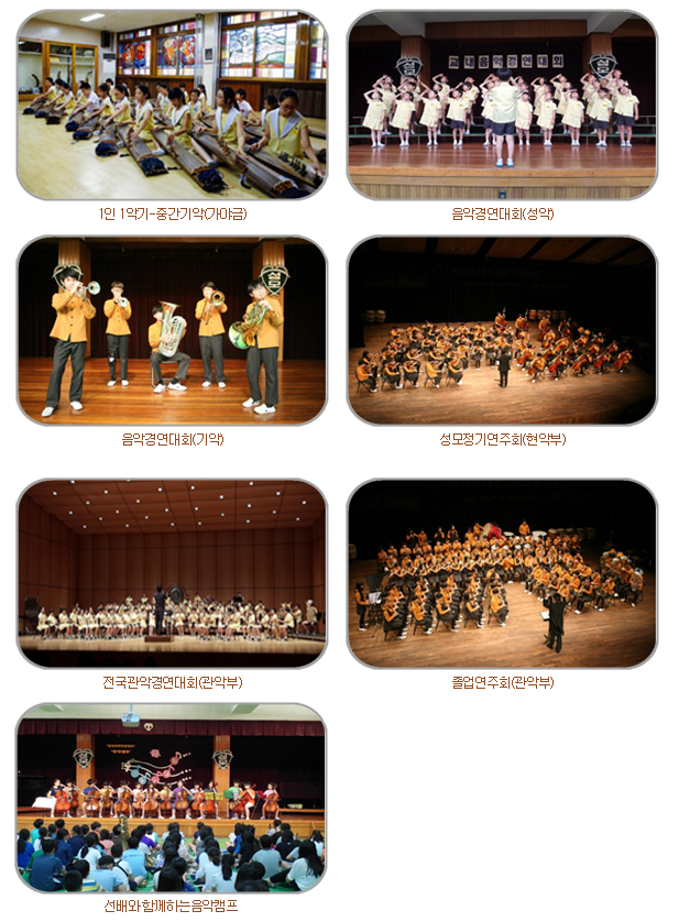 전교생이 중간기악 시간을 통화여 1인 1악기 연주 기능을 체득하고 방과후학교를 통해 심화 교육을 꾀하고 있으며 연주회 및 발표회를 통해 다양한 표현의 기회를 제공하고 있다.