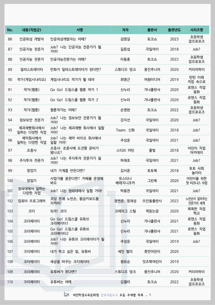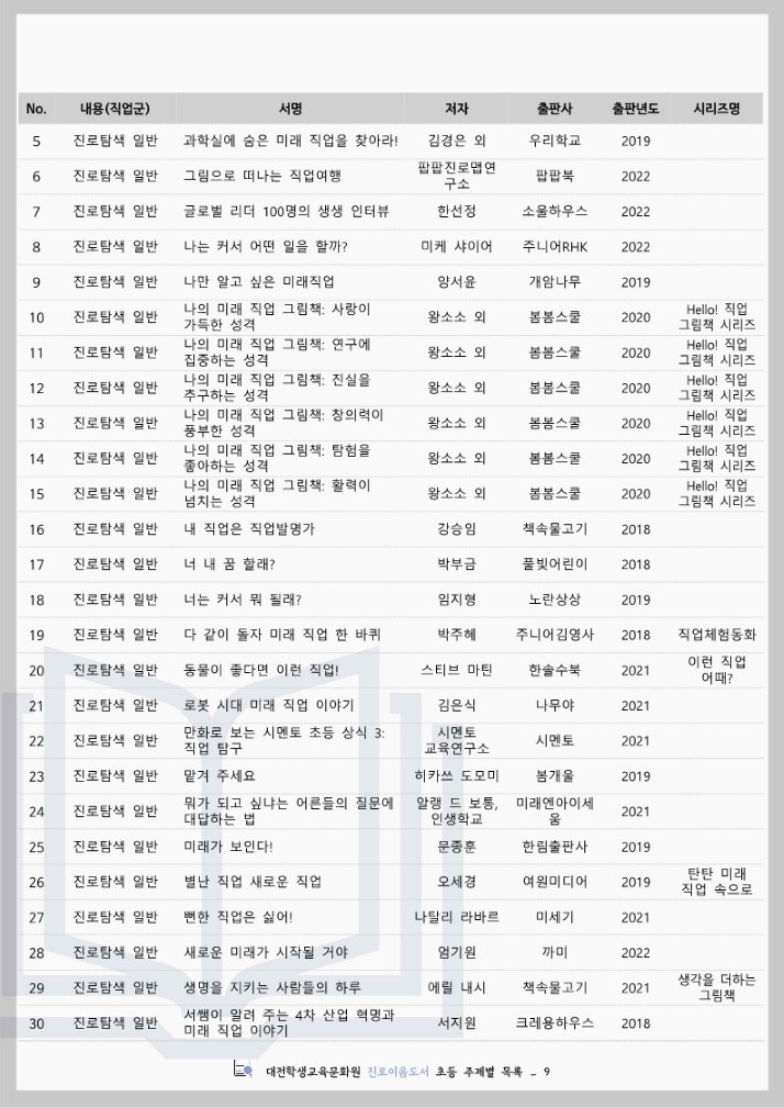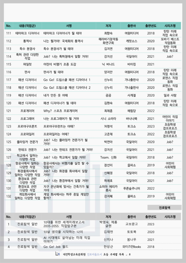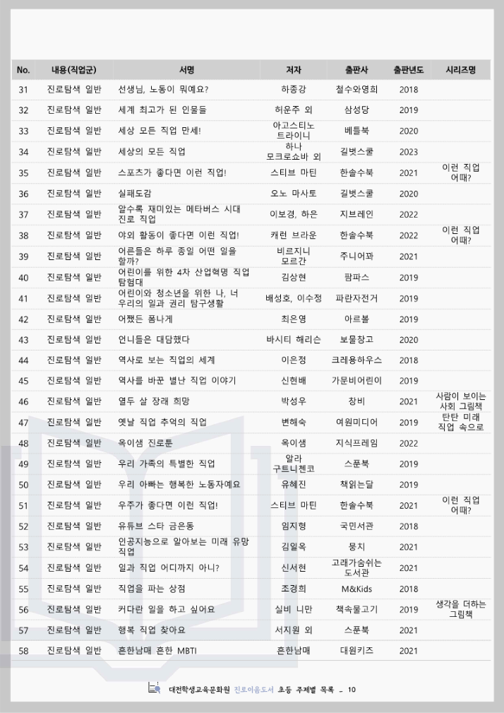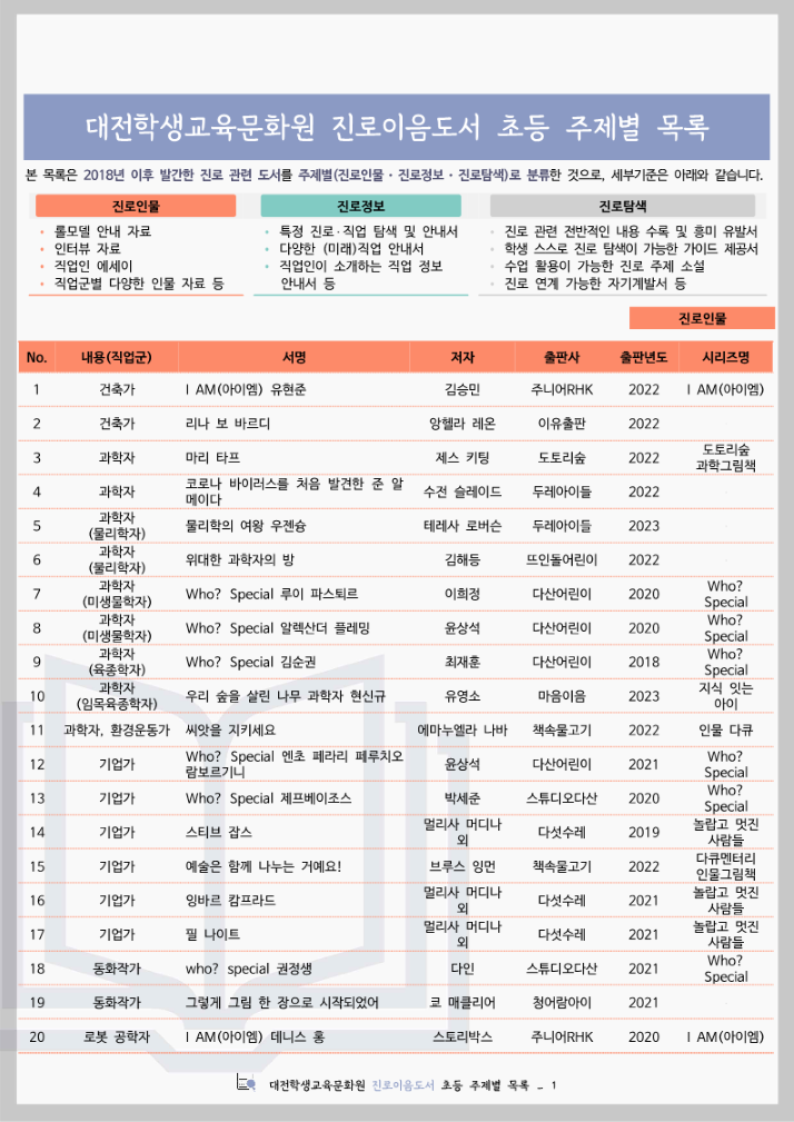 대전학생교육문화원 진로이음도서 초등 주제별 목록