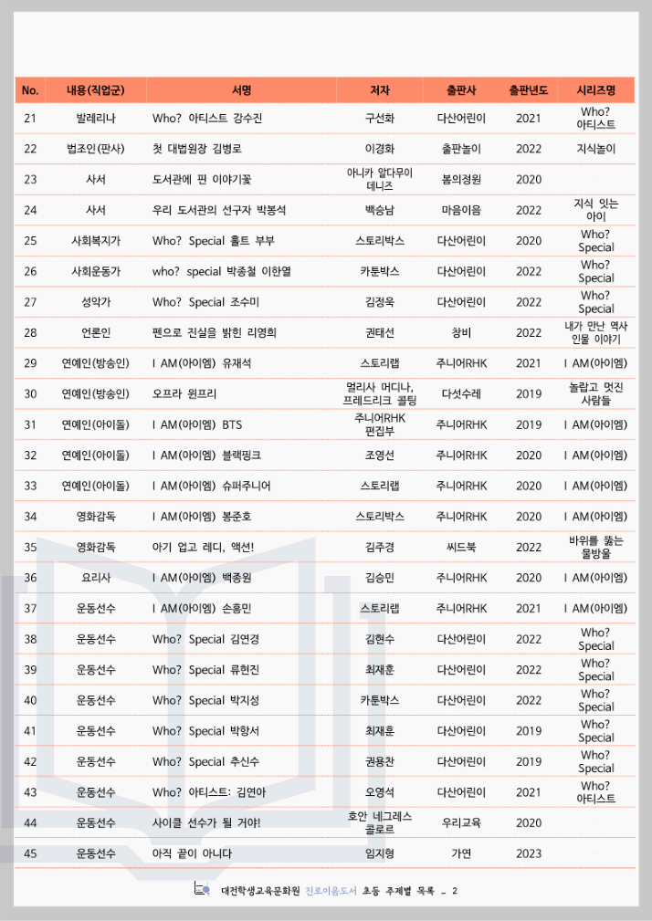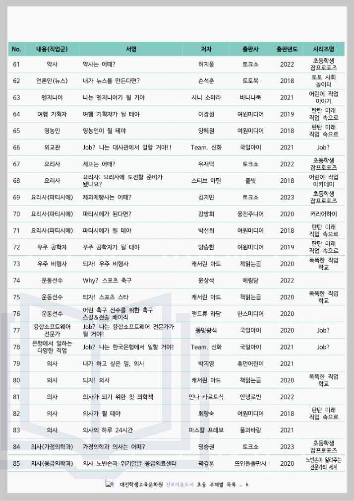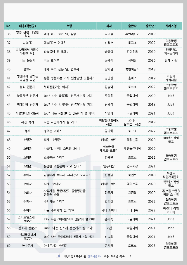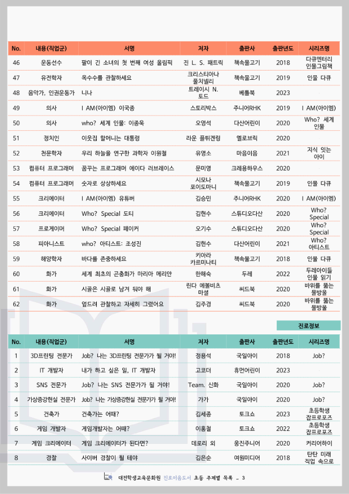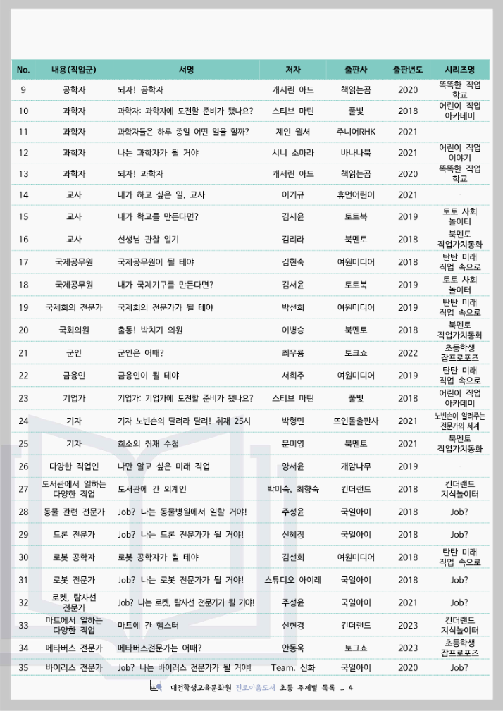 대전학생교육문화원 진로이음도서 초등 주제별 목록