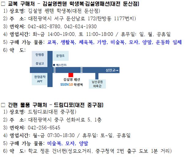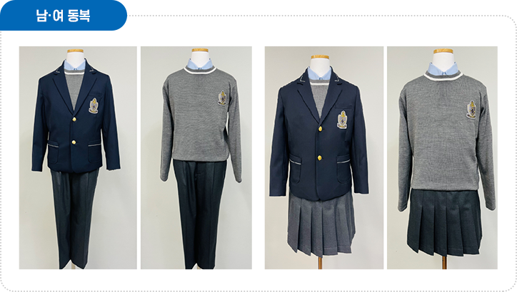 *하늘색 셔츠, 스웨터, 재킷 진회색 치마바지(검정 스타킹) 또는 긴 바지(선택) |